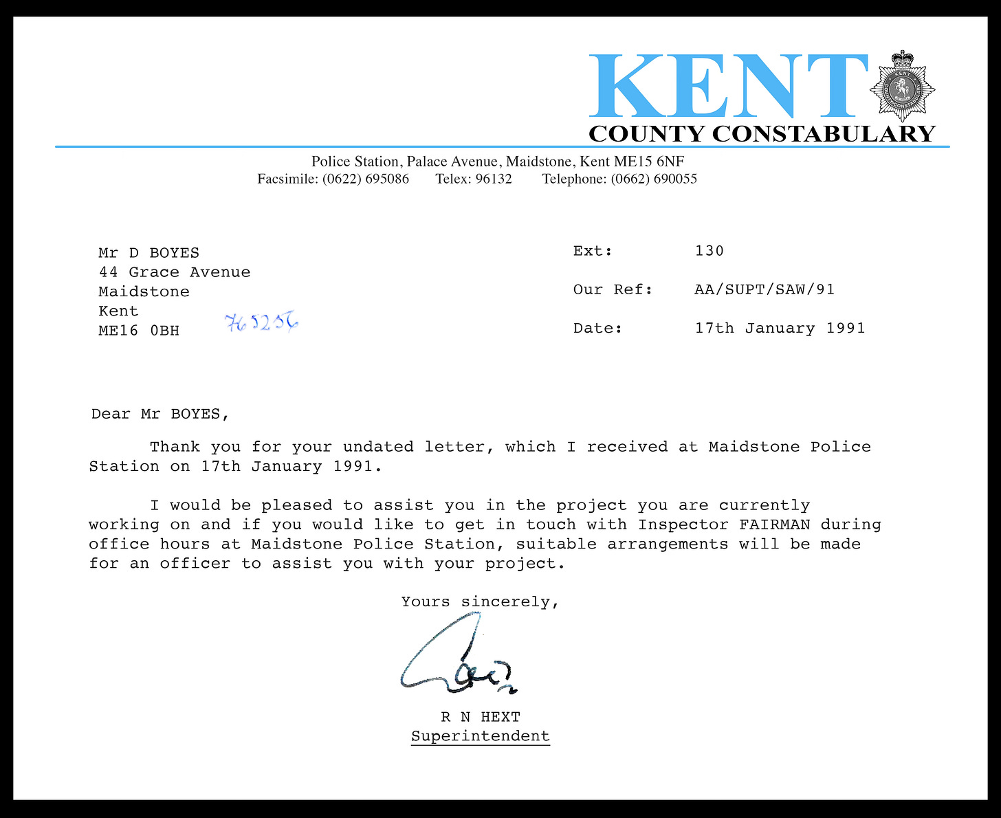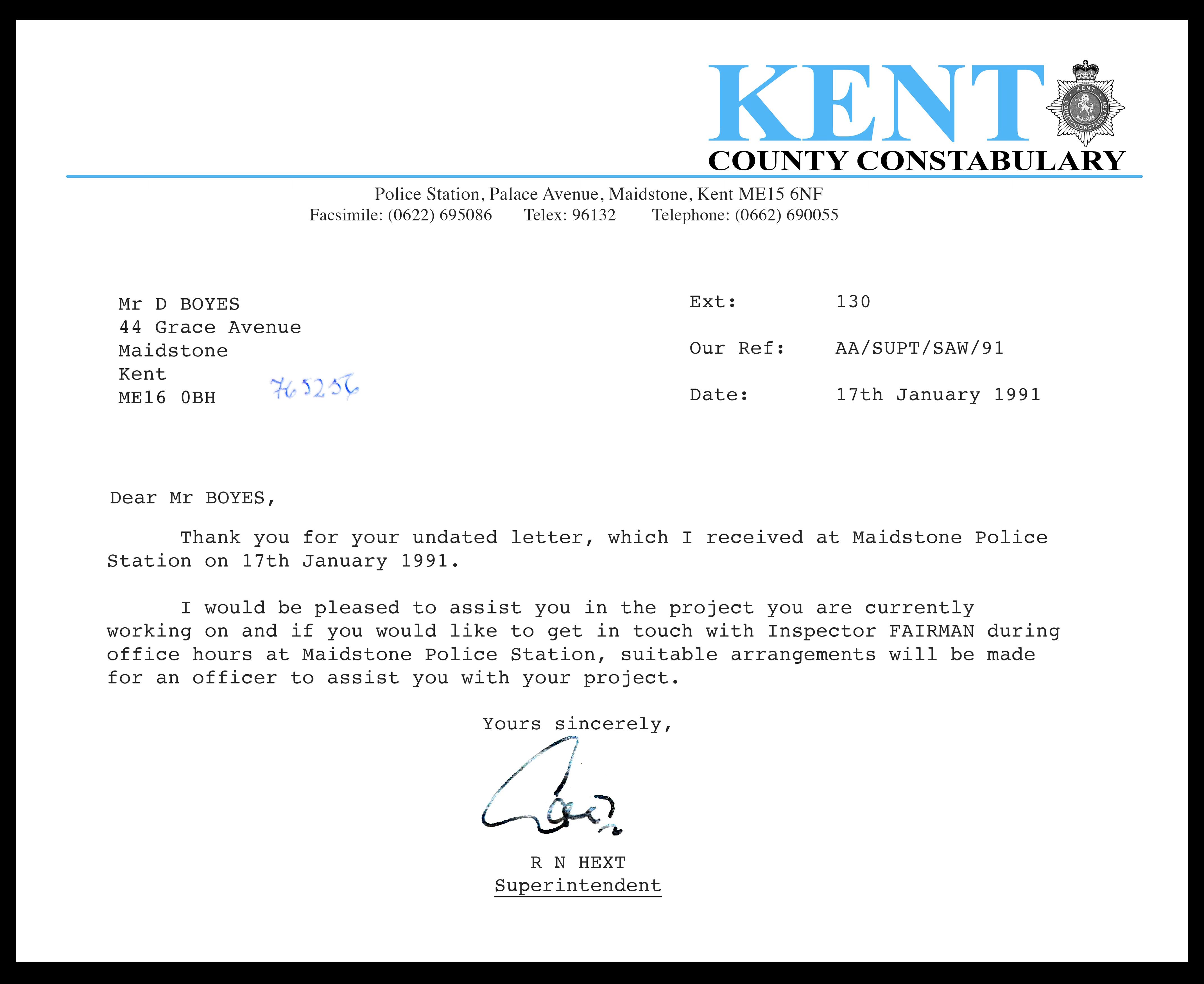 One of the earlier scenes I shot, required a policeman, so I decided to write a letter to my local police station in Maidstone, asking if I could get permission to have a police officer for a couple of hours. Incredibly, Super Intendant Hext authorised it, asking me to get in contact with PC Fairman to figure out the details. They asked to have a copy of the scene to review and made me omit the part where the policeman punches Steven in the stomach (which was fair enough).