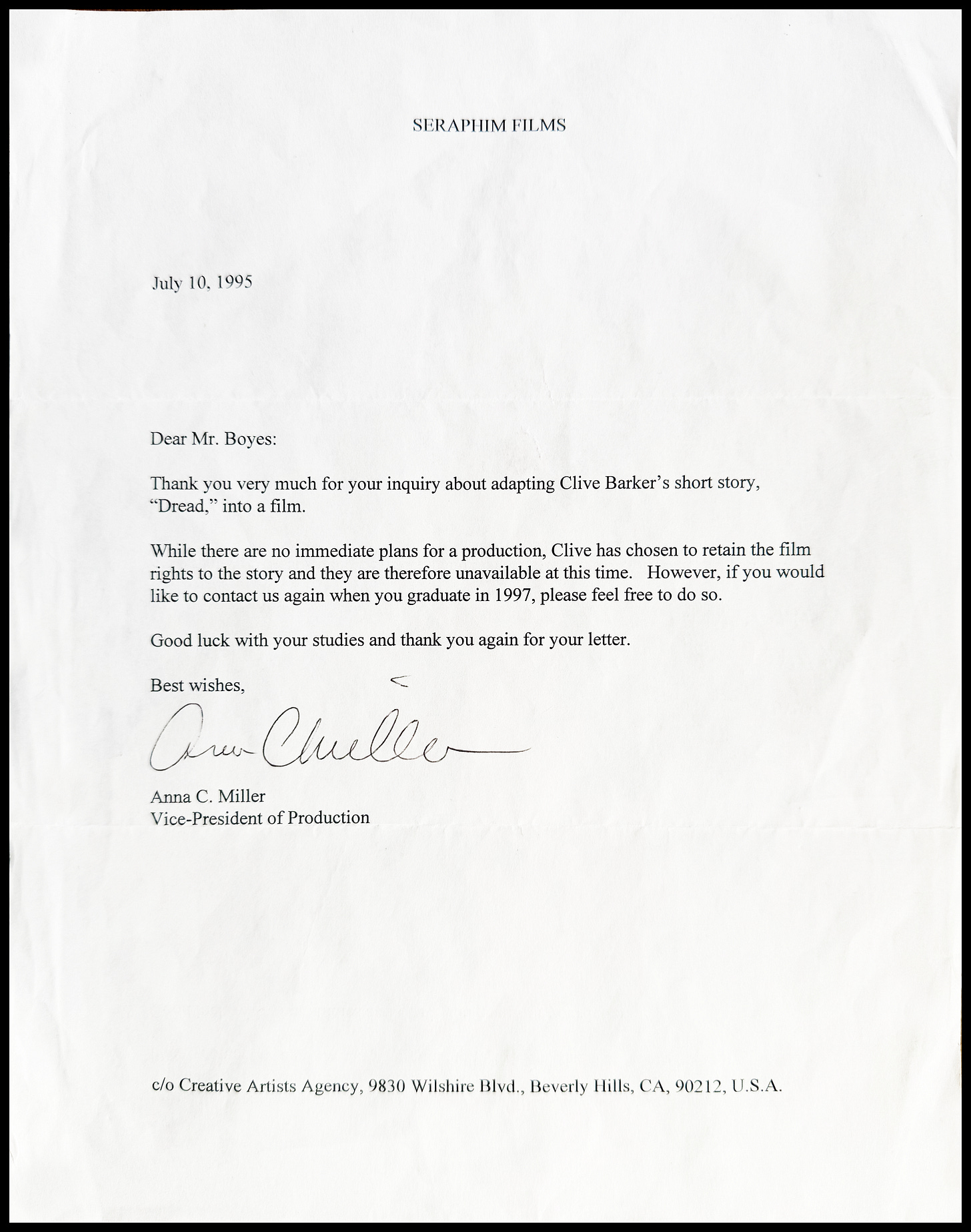 Anticipating this one-off opportunity, I bought a ticket and made a VHS copy of my Dread trailer, with an accompanying letter for Clive Barker. I wanted to know if anyone had the theatrical rights to Dread, explaining that I had made an amateur version of it when I was younger, but that one-day I’d like to make it for real.