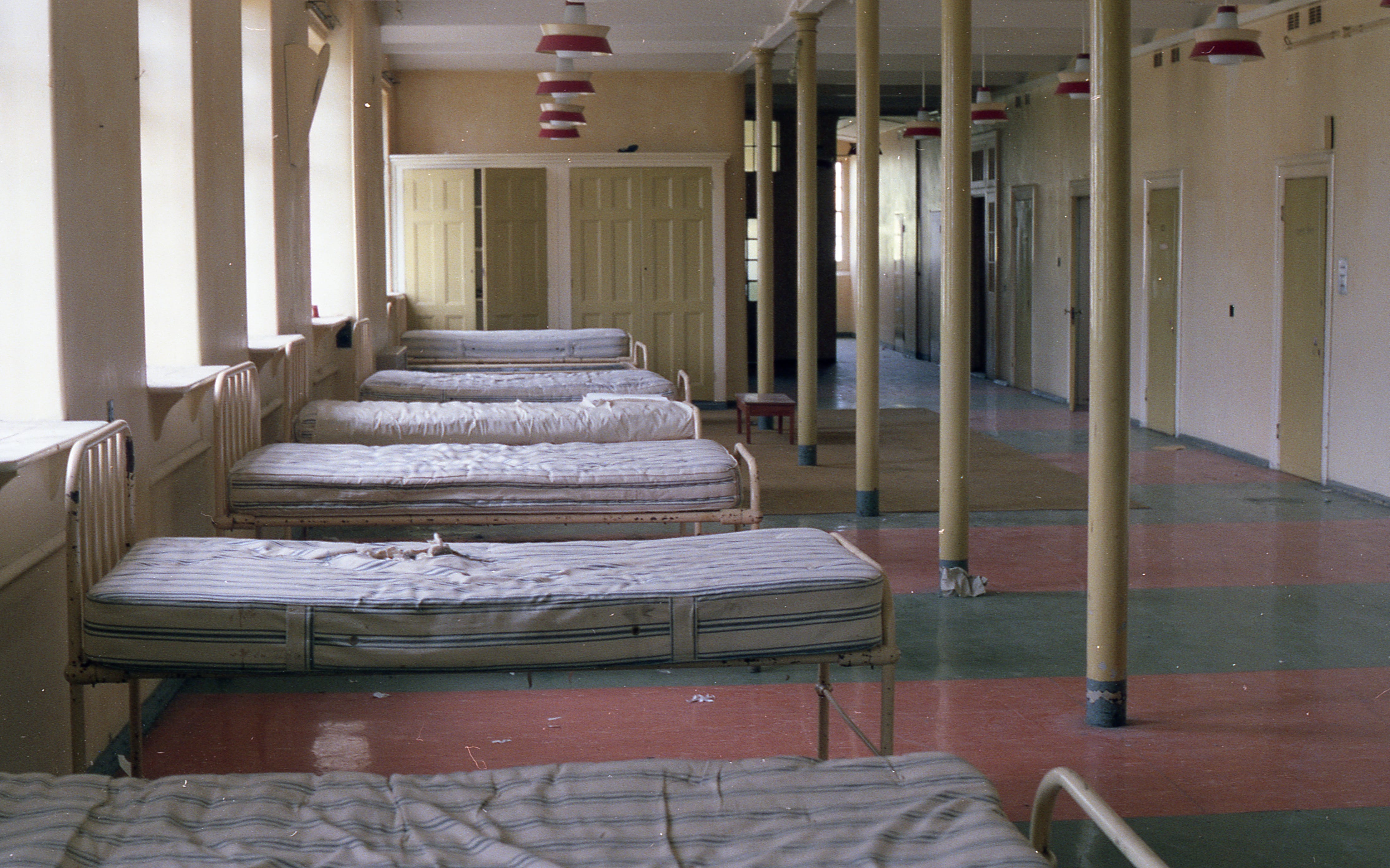 I dressed the set in the daytime on my own, having chosen a ward on the first floor, that had the most character and period detail. All the broken-down metal framed beds were stacked up in sections on the ground floor, where all the windows had been boarded up for security, so I had to carry the headboards, footboards, spring frames and mattresses up to the first floor, assemble each bed and line them up against the outer wall, under each sash window.